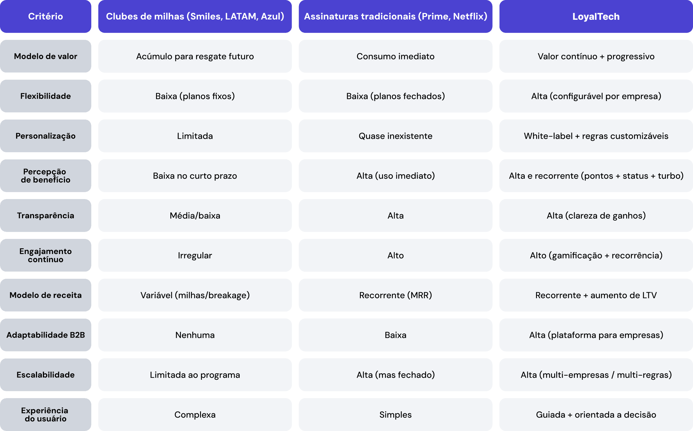 A resposta não estava em criar mais uma feature. Ela estava em posicionar o produto entre dois modelos já existentes. De um lado, programas de fidelidade tradicionais, focados em acúmulo futuro e com baixa percepção de valor imediato. Do outro, assinaturas, com valor claro, mas pouca flexibilidade.
